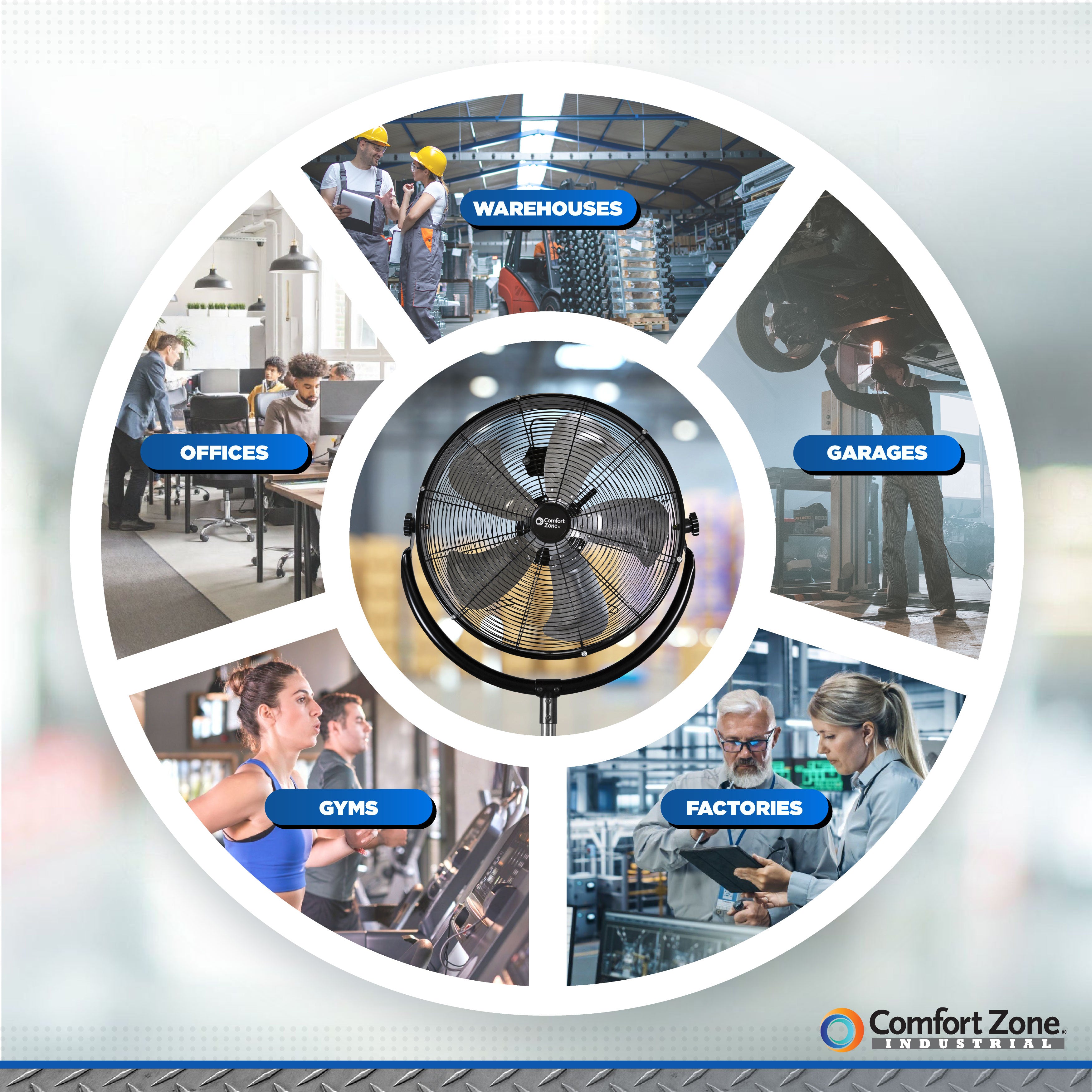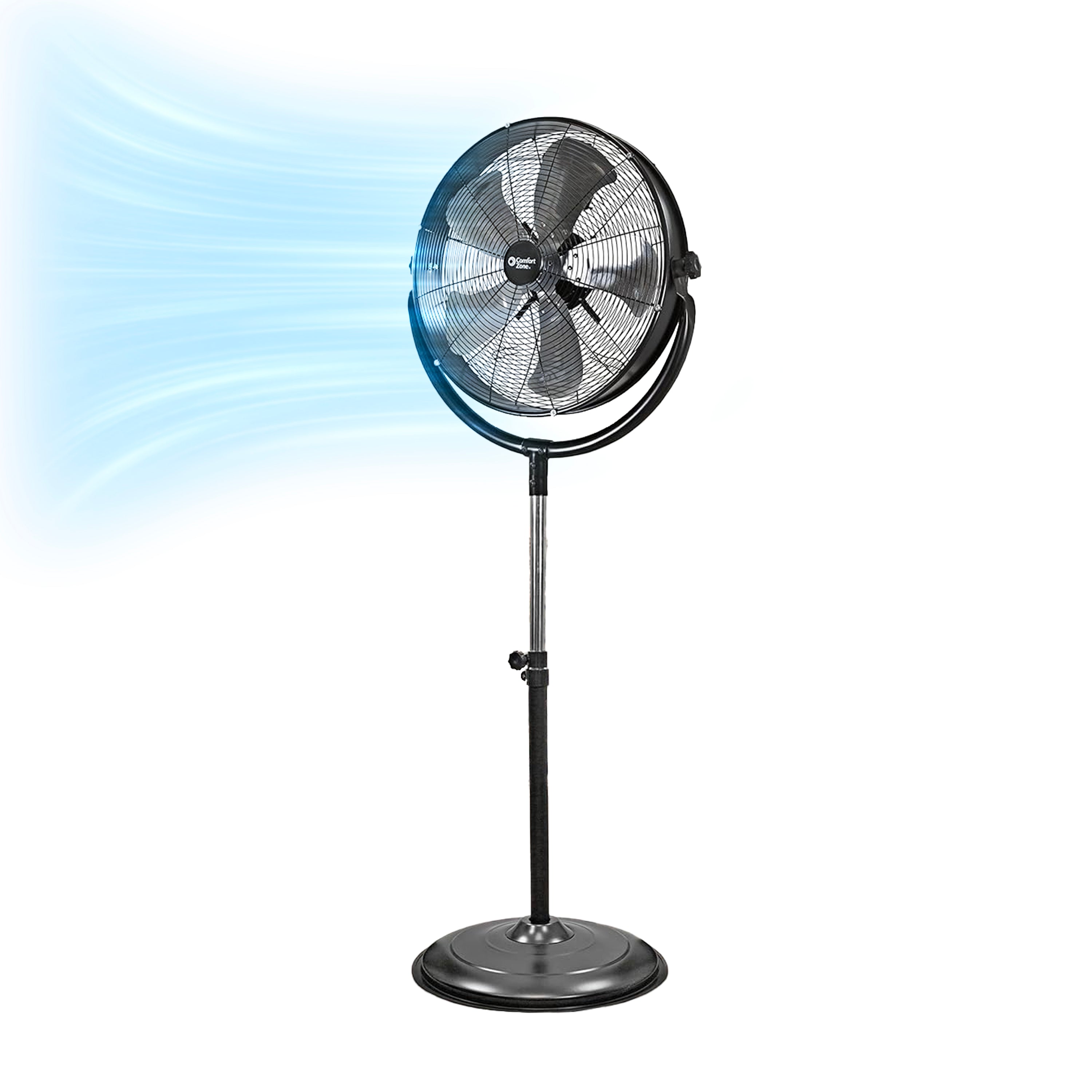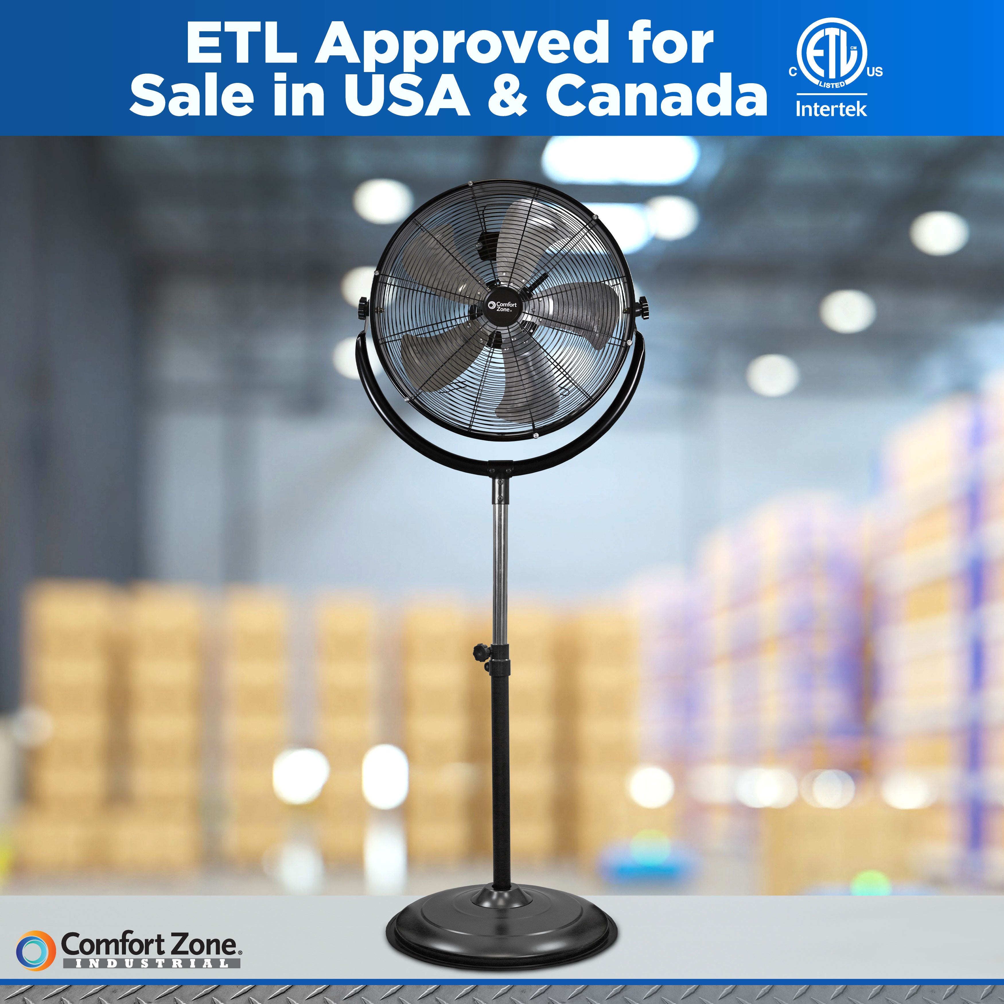 This Comfort Zone 20in high-velocity pedestal fan gives you increased control over airflow output, keeping air moving at the right volume for maintaining a cool and comfortable environment. The high-velocity industrial fan has 3-speed control options, so you can select low-, medium- or high-velocity output. Efficiency in air circulation and optimized airflow can be customized for any home, garage or workspace. You can position the floor standing fan anywhere you like and easily adjust the height from low to tall via the tool-free adjustment knob. The fan head has a 180° adjustable tilt so it can be set to just the right angle for targeting cool airflow wherever its needed. Easy to set up with no assembly required, the pedestal fan has a slim drum design to make it more lightweight and convenient to use. It is quick and simple to transport when you want to take it from the house to the garage. With an all-metal body, this stand-up fan is engineered for durability and lasting performance. The individually balanced blades ensure smooth rotation, and the black finish complements the look of any interior setting. The floor fan is ETL compliant, and it includes a long 60 in. power cord that offers extended reach. It is easily stored in the built-in cord wrap when not in use.