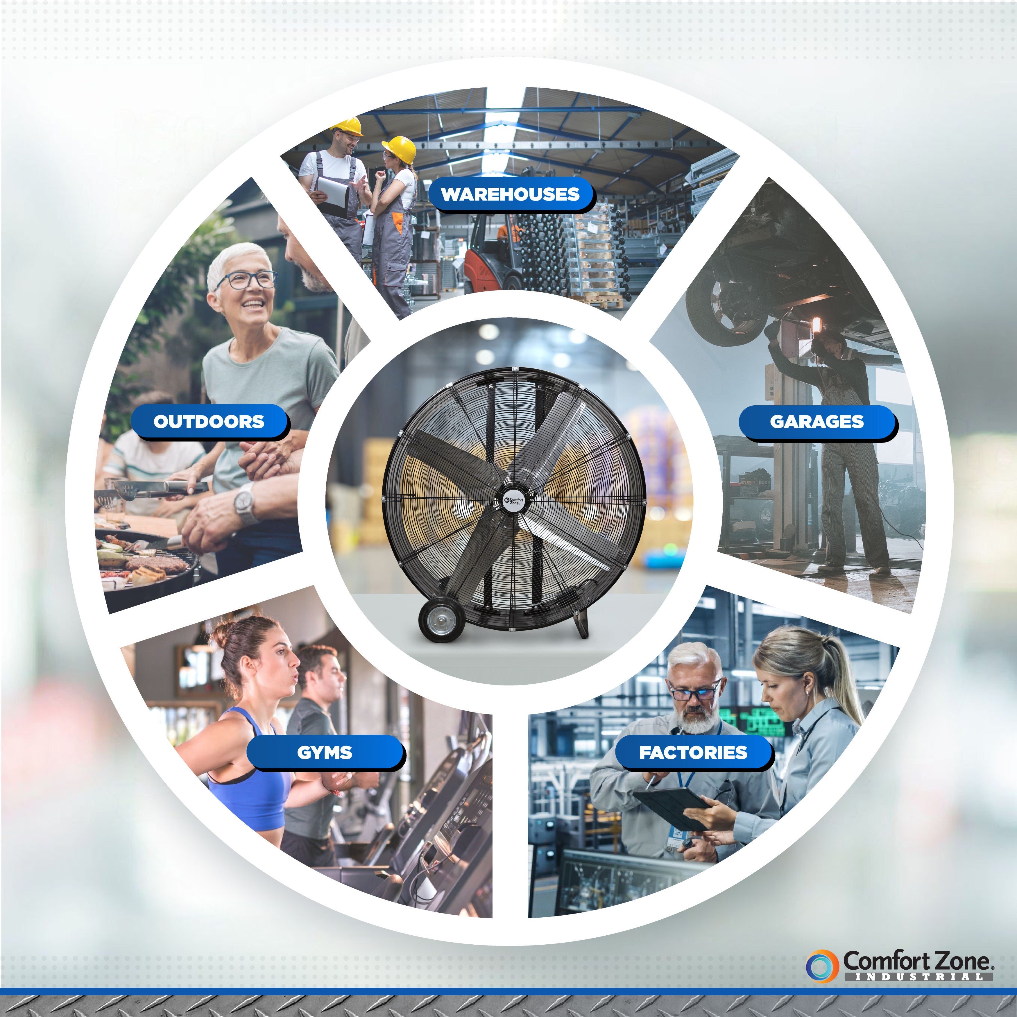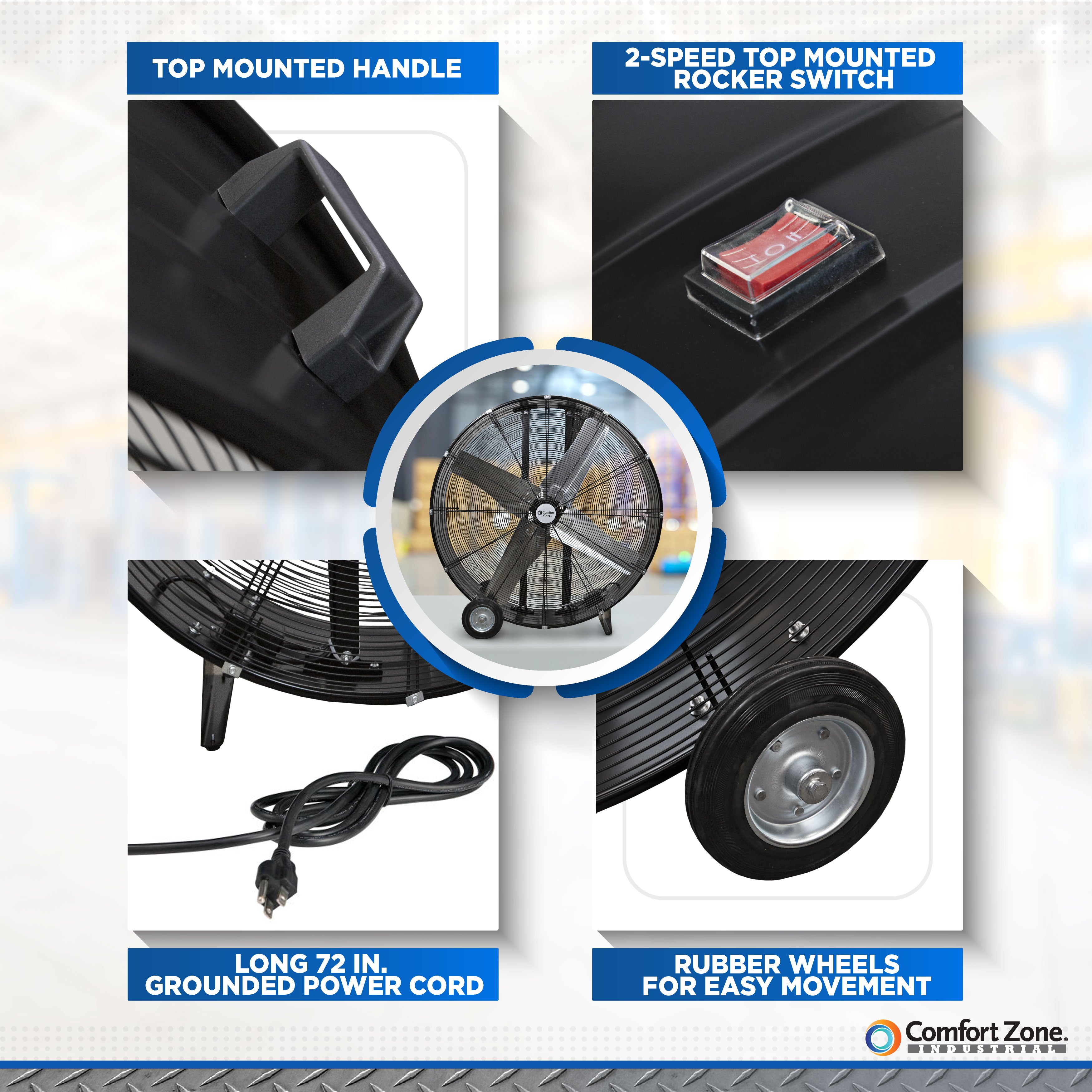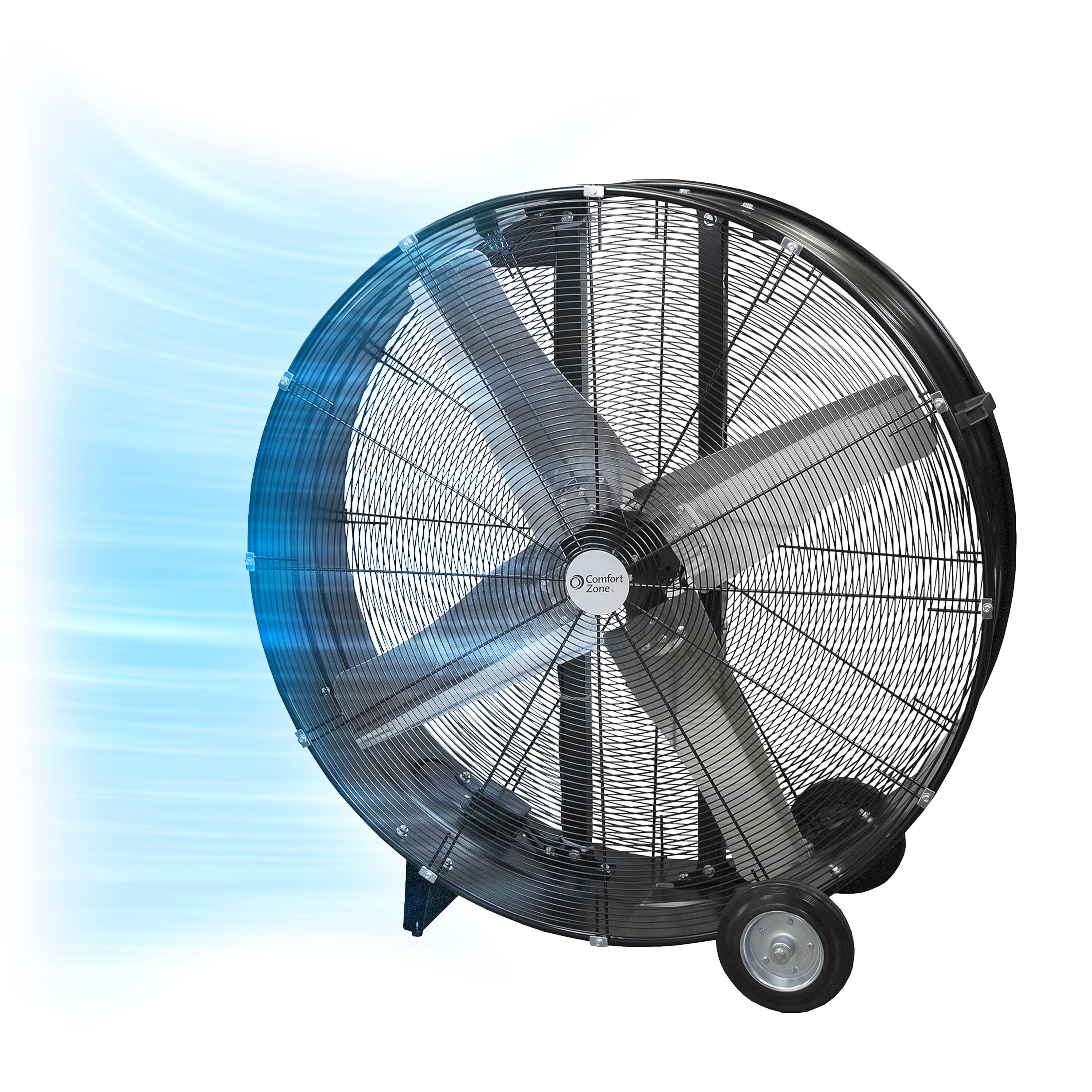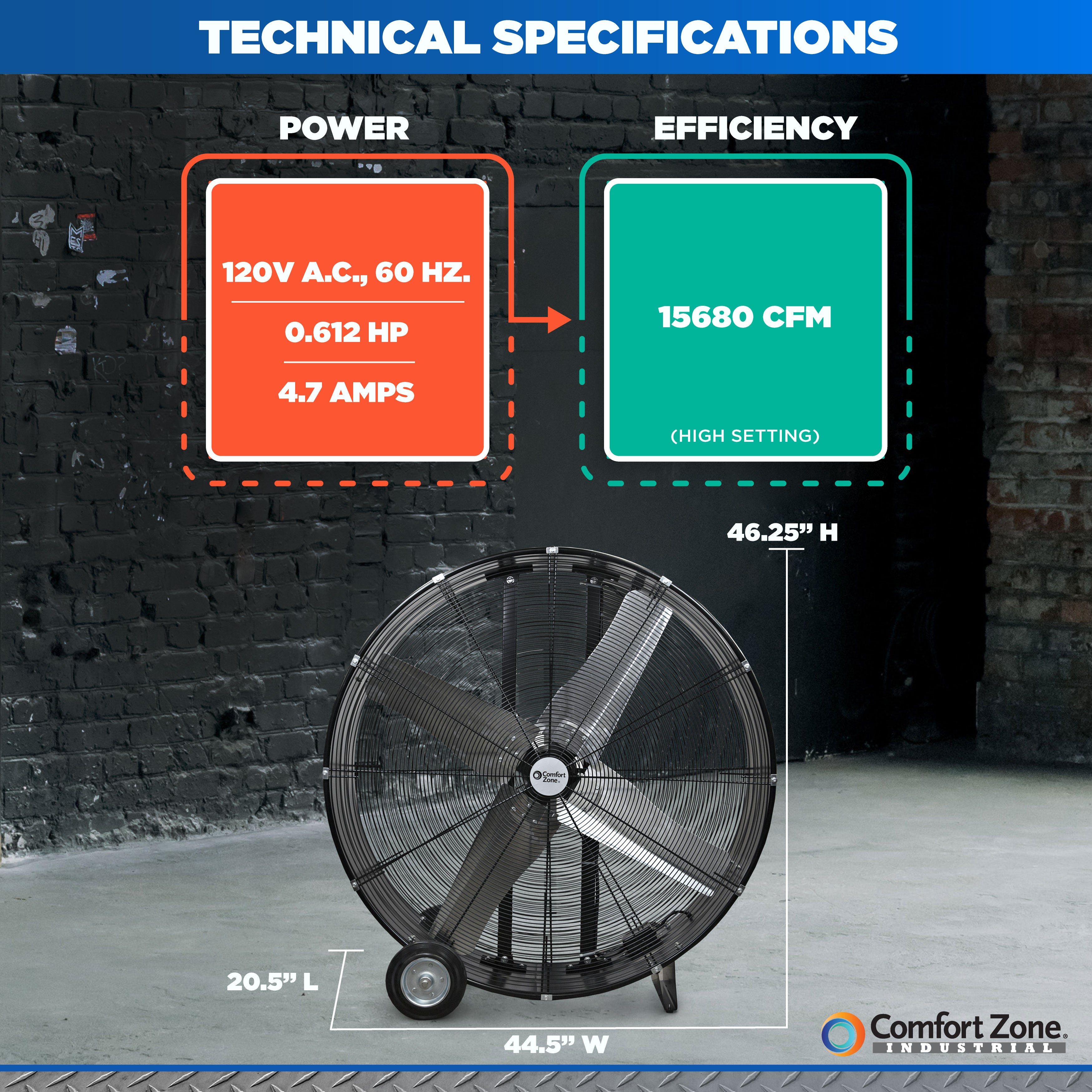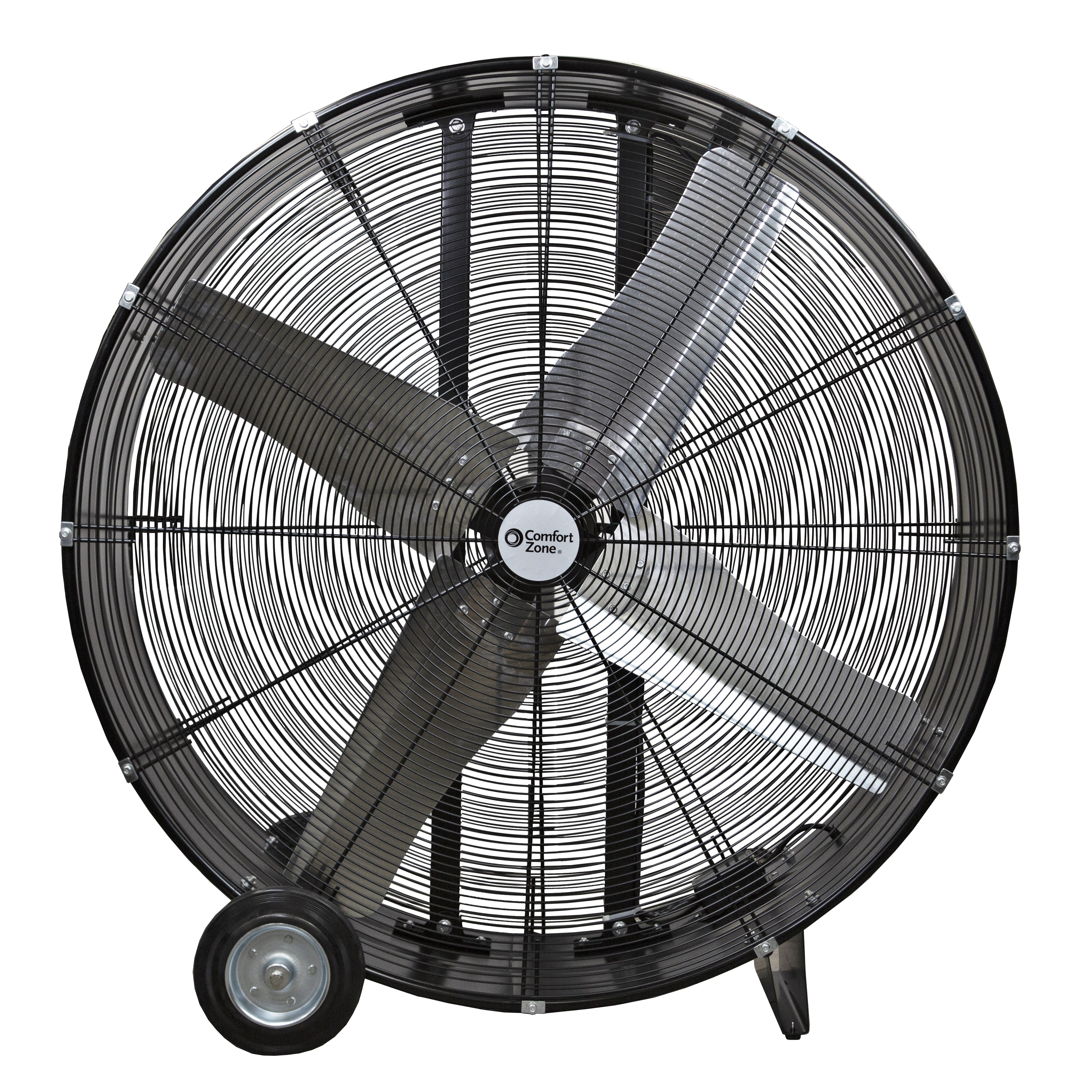 This Comfort Zone 42in. high-velocity drum fan offers an exceptional solution for keeping any environment cool and comfortable. It features two-speed control so you can choose between lower-velocity and high-velocity output. Such optimization of airflow provides efficient air circulation in a variety of environments, such as your garage or workshop. With directional airflow and equipped with a 180-degree cradle mount, the high-power fan can be adjusted and tilted to direct the flow of air anywhere you want it. Its integrated adjustment knobs lock the fan into place at the ideal angle, without the need for tools. You can easily unlock it and make further adjustments to meet changing conditions or needs. This easy-to-set-up floor fan requires no assembly and features a large, easy-to-grab handle and a pair of large rubber wheels allow you to place it anywhere you like. This durable drum fan is engineered for durability and lasting performance and the direct drive motor delivers improved efficiency, while individually balanced blades ensure smooth rotation. The floor fan includes a long 60in power cord that provides extended reach that can be stored easily stored using in built-in cord wrap. All Comfort Zone industrial products are designed and tested to meet global quality standards including UL, ETL, SAA, CE, NOM.