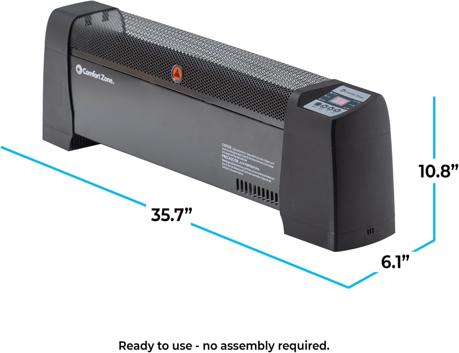 In addition its smart, low-profile design, this digital baseboard heater creates a warm, inviting room for relaxing in. The Comfort Zone Convection Baseboard Heater is recommended for use in medium-sized rooms up to 1200 square feet. It operates silently, so it won't disturb anyone in the room during TV shows, while chatting or sleeping. The two heat settings and digital adjustable thermostat with temperature display provide the level of control you need to create your optimal temperature. The heater includes a range of safety features including a safety tip-over switch that will cut power if your heater is accidentally knocked over, a stay-cool body, and an overheat protection sensor that prevents it from getting too hot. Dent-proof end panels provide lasting durability. Also effect for cost saving, the electric baseboard heater can help you save on home heating bills by allowing you to direct heat where you want it, rather than increasing heat throughout the house.