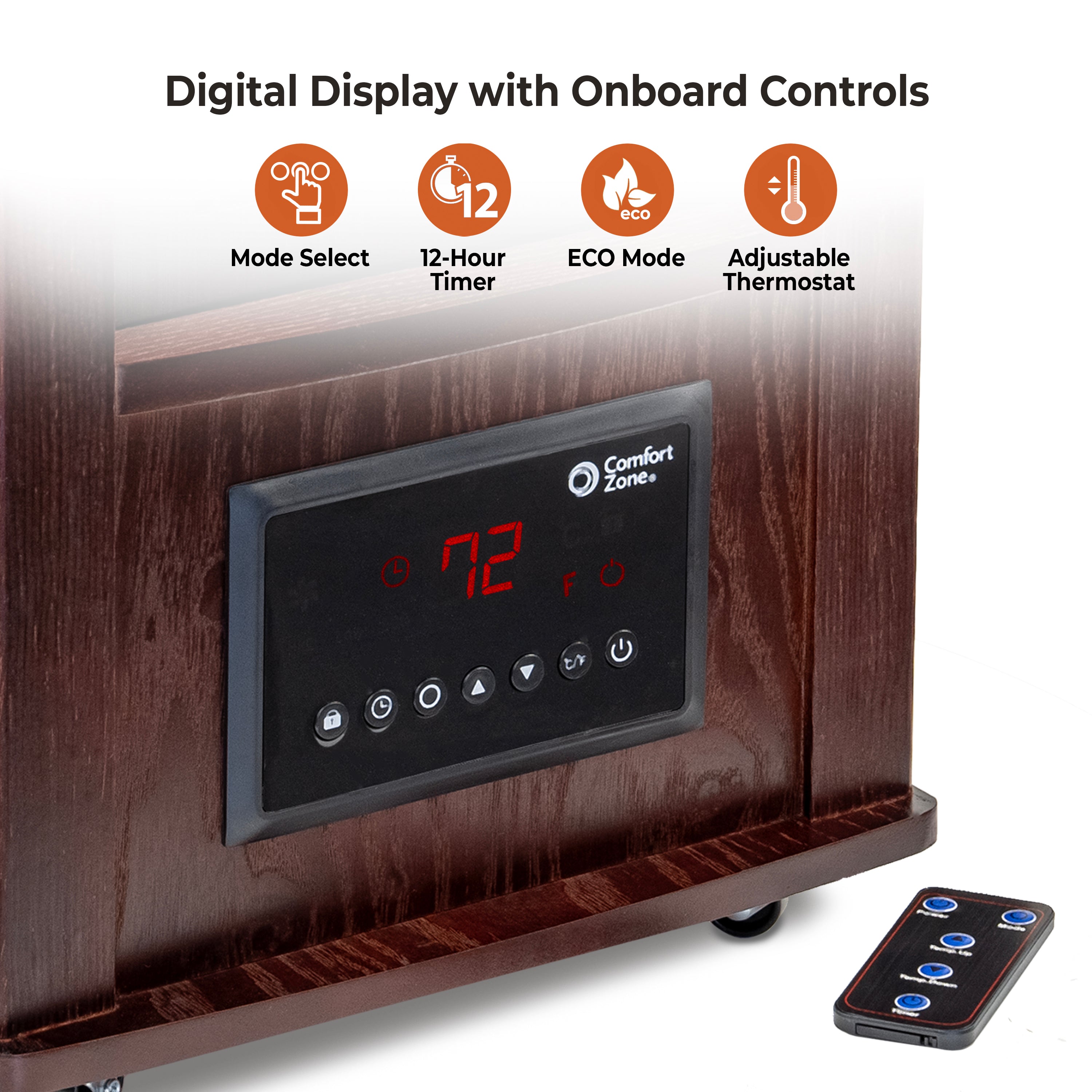 With four high-power quartz infrared heating elements, the Premium Wood Cabinet Infrared Heater by Comfort Zone provides a clean efficient heat source with whisper quiet operation. It has fan-forced heat circulation with two heat settings and an energy saving ECO mode. This heater includes the convenience of a 12-hour auto on/off timer and a digital thermostat with easy to read display. The full function remote allows electronic control from across the room and the heaters swivel casters provides easy movement from room to room. Safety features include tip-over switch, and overheat protection system. Heater comes in cherry finish and adds a touch of sophistication and class to any medium room size.