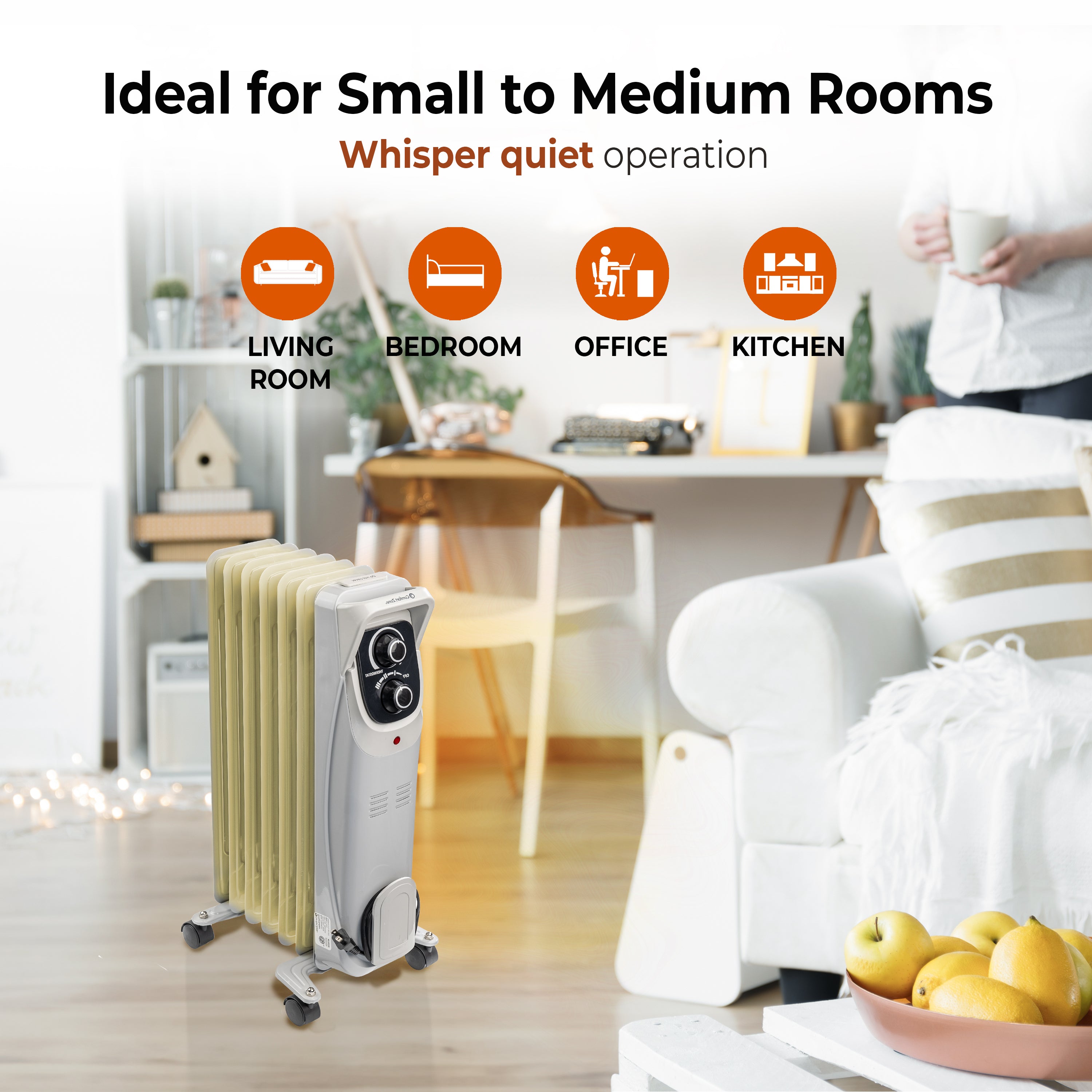 Designed to operate silently, this Comfort Zone Electric Oil-Filled Radiator Heater won’t disrupt your sleep, work or study sessions with annoying rattling or the whooshing of rotating fan blades. The radiator heater boasts three convenient heat settings, making it a snap to warm your space to a comfortable temperature. The oil radiator heater rolls easily in any direction using convenient swivel casters, while an oversized stay-cool handle makes it easy to push or pull around after each use without burning your fingers. The tip-over switch and overheat protection sensor help to ensure that the unit operates safely throughout the day. Ideal for medium-sized rooms, the electric radiator heater has a compact design that doesn’t take up too much floor space. It comes in a smart white finish that will complement many different spaces and décor styles with ease. Convenient built-in cord storage helps to keep the oil-filled radiator heater’s power cord neatly contained when it is not in use.