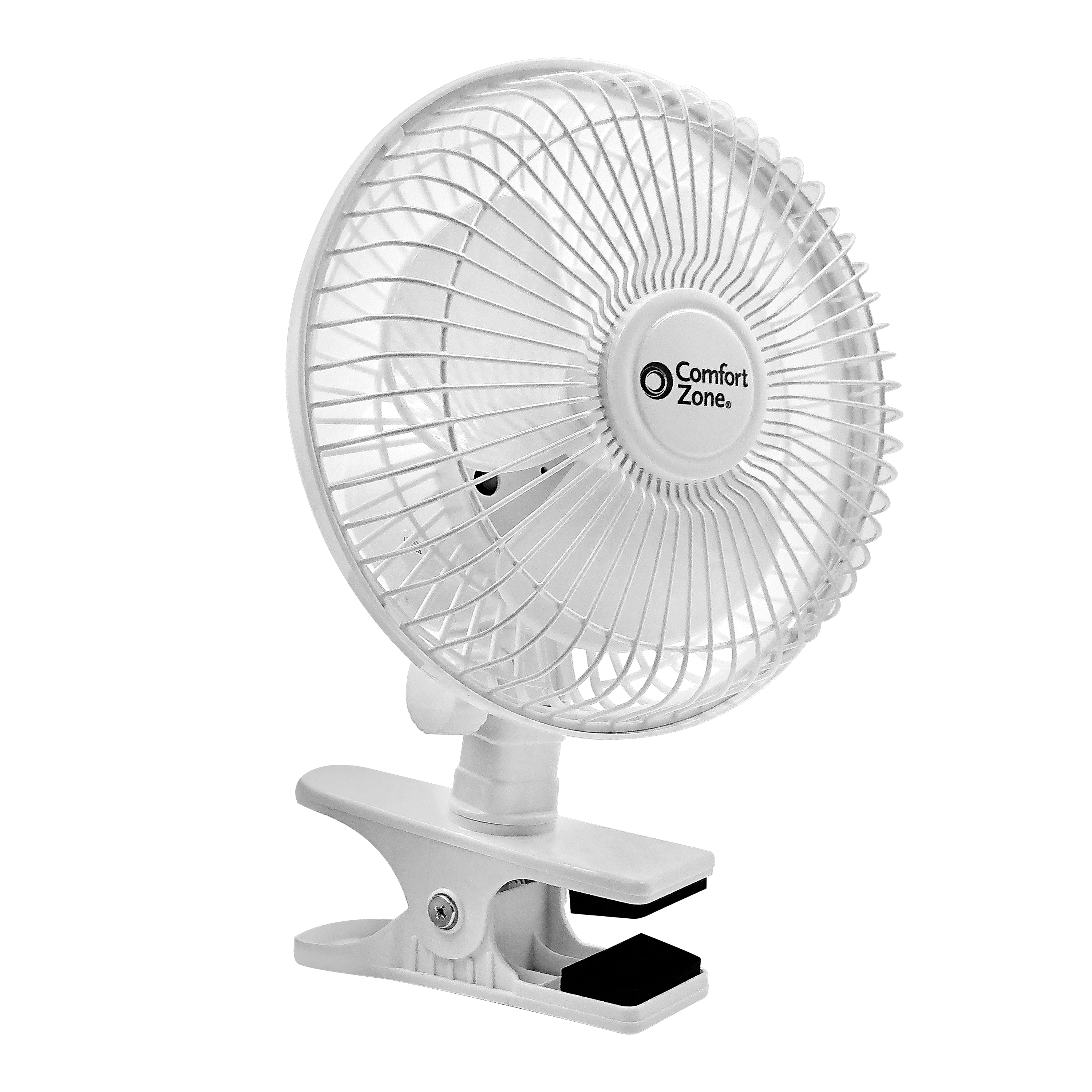Enjoy targeted cooling comfort while you work or rest using this 6” Comfort Zone 2-speed desk fan with clip. With its compact design and neutral white coloring, this quiet indoor fan is a discreet option for any workspace. The strong clamp ensures a firm grip on most desks, shelves or other convenient surfaces so you can enjoy powerful airflow when and where you need it. Two speed settings let you choose between high and low output to suit your comfort level. This fan can rotate 360 degrees and has an adjustable tilt function so you can position it for optimal performance with a simple twist of a knob. Whether you need this desk fan for office or home use, you can benefit from its quiet operation while you work or rest. A coated metal safety grill protects fingers from moving blades and a coiled cord stretches to reach outlets without becoming easily tangled. Lightweight but powerful, this quiet portable fan is easy to move from surface to surface or room to room using the handy built-in carry handle.